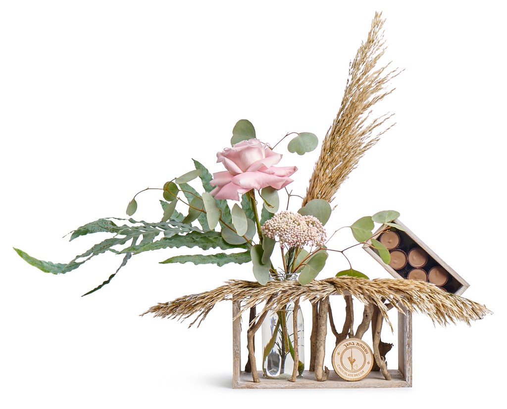 Add a touch of natural beauty to your sukkah with this handcrafted birch vase. Made from premium birch wood, it boasts a charming sukkos-themed design and is adorned with fresh roses and foliage. Create a warm and welcoming atmosphere with this delightful centerpiece. Dimensions 13'' x 15''